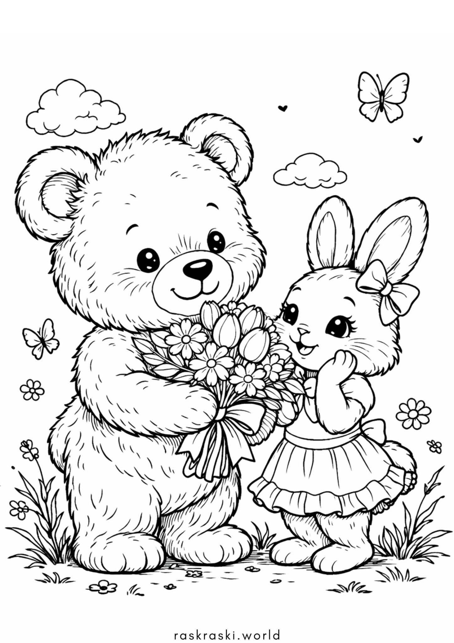 Раскраска К 8 марта — Мишка дарит цветы зайчихе
